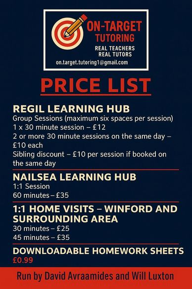 Please book a session directly from the Home page or by using the 'MORE' section on our drop down menu to make an online booking, or alternatively email on.target.tutoring1@gmail.com for more information or to make a booking at our Nailsea Hub.